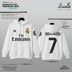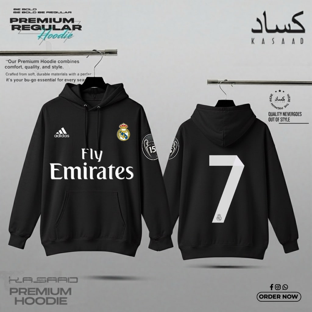Celebrate the Kings of Europe with the KASAAD Premium Real Madrid Edition Hoodie. A tribute to the club’s 15th Champions League victory and its greatest legend, Cristiano Ronaldo. Featuring the classic “Fly Emirates” sponsor, CR7 branding on the back, and the prestigious “15” trophy badge on the sleeve.